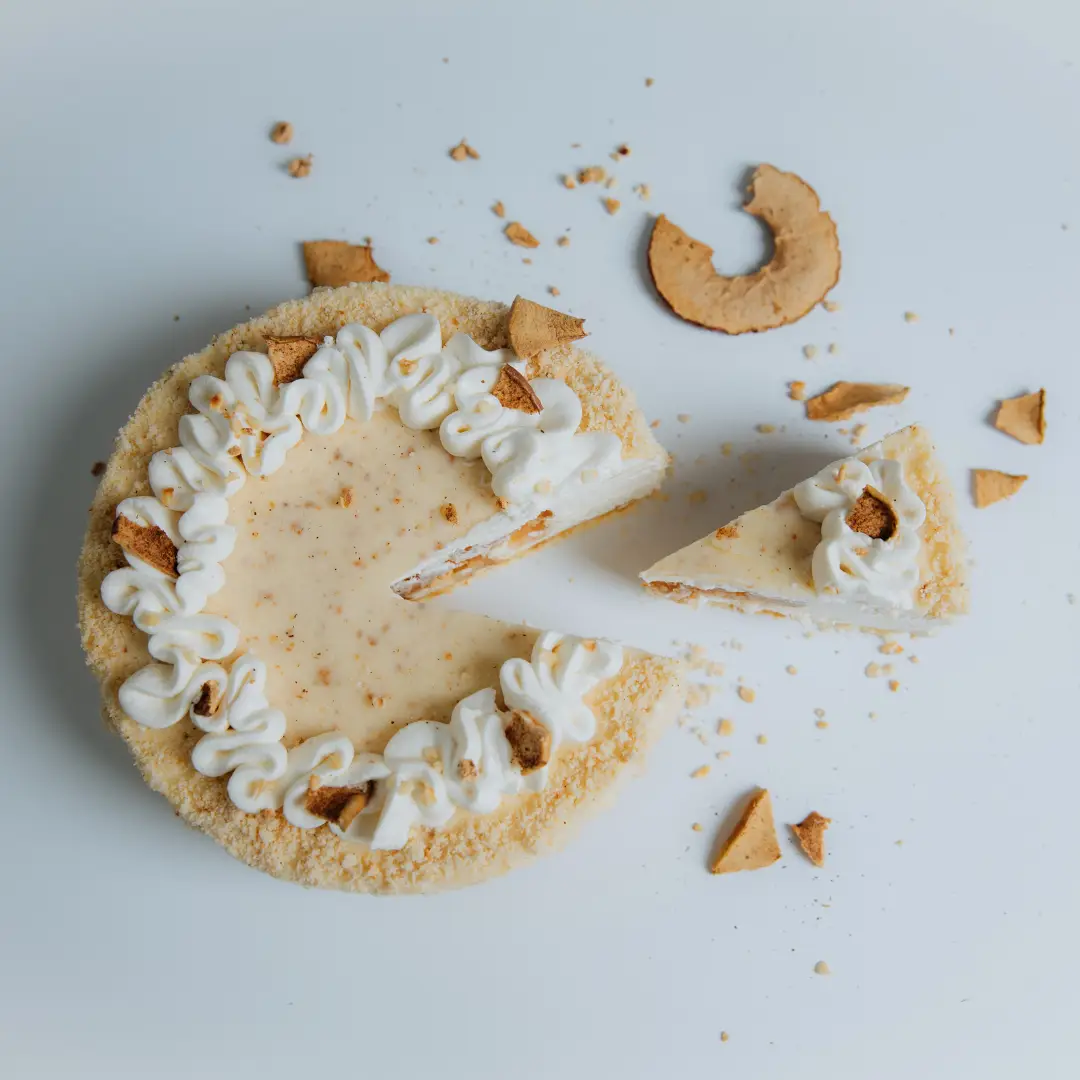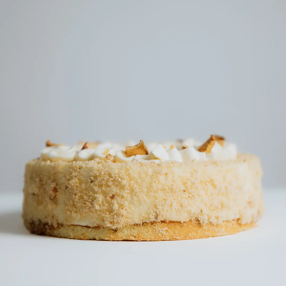 Bijeli biskvit premazan Praliné pastom, mousse od bijele čokolade, insert od jabuke s cimetom, bijela glazura s cimetom, obložena hrskavim crumbleom.